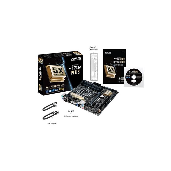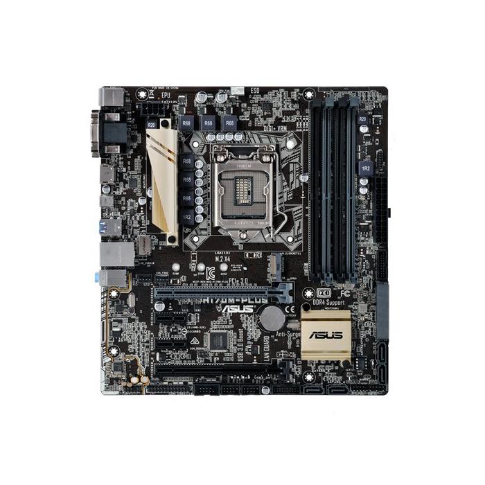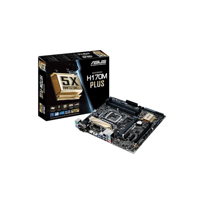 CPU\nIntel® Socket 1151 for 6th Generation Core™ i7/Core™ i5/Core™ i3/Pentium®/Celeron® Processors \nSupports Intel® 14 nm CPU\nSupports Intel® Turbo Boost Technology 2.0 \n* The Intel® Turbo Boost Technology 2.0 support depends on the CPU types.\n* Refer to www.asus.com for CPU support list\n\nChipset\nIntel® H170\n\nMemory\n4 x DIMM, Max. 64GB, DDR4 2133 MHz Non-ECC, Un-buffered Memory *\nDual Channel Memory Architecture \nSupports Intel® Extreme Memory Profile (XMP)\n\n\nGraphic\nIntegrated Graphics Processor- Intel® HD Graphics support \nMulti-VGA output support : HDMI/DVI/DVI-D/RGB ports \n- Supports HDMI with max. resolution 4096 x 2160 @ 24 Hz / 2560 x 1600 @ 60 Hz\n- Supports DVI-D with max. resolution 1920 x 1200 @ 60 Hz\n- Supports RGB with max. resolution 1920 x 1200 @ 60 Hz\nMaximum shared memory of 1024 MB\nSupports Intel® InTru™ 3D, Quick Sync Video, Clear Video HD Technology, Insider™\nSupports up to 3 displays simultaneously\n\nMulti-GPU Support\nSupports AMD Quad-GPU CrossFireX™ Technology\n\nExpansion Slots\n1 x PCIe 3.0/2.0 x16 (x16 mode, gray) \n1 x PCIe 3.0/2.0 x16 (max at x4 mode) \n2 x PCIe 3.0/2.0 x1\n\nStorage\nIntel® H170 chipset : \n1 x M.2 Socket 3, , with M key, type 2242/2260/2280 storage devices support (both SATA PCIE mode)\n1 x SATA Express port, gray, Compatible with 2 x SATA 6.0 Gb/s ports\n6 x SATA 6Gb/s port(s), gray\nSupport Raid 0, 1, 5, 10\nSupports Intel® Smart Response Technology*1\n\nLAN\nIntel® I219V, 1 x Gigabit LAN Controller(s)\nIntel® LAN- Dual interconnect between the Integrated LAN controller and Physical Layer (PHY)\n\nAudio\nRealtek® ALC887 8-Channel High Definition Audio CODEC *2\n- Supports : Jack-detection, Front Panel Jack-retasking\nAudio Feature :\n- Audio Shielding: Ensures precision analog/digital separation and greatly reduced multi-lateral interference\n- Dedicated audio PCB layers: Separate layers for left and right channels to guard the quality of the sensitive audio signals\n- Premium Japanese-made audio capacitors: Provide warm, natural and immersive sound with exceptional clarity and fidelity\n\nUSB Ports\nIntel® H170 chipset : \n6 x USB 2.0/1.1 port(s) (2 at back panel, black, Type-A, 4 at mid-board)\nIntel® H170 chipset : \n6 x USB 3.0/2.0 port(s) (2 at back panel, blue, Type-A, 4 at mid-board)\nIntel® H170 chipset : \n1 x USB 5Gb/s port(s) port(s) (1 at back panel, black, Type-C, Reversible, Support 3A power output)\n\nSpecial Features\nASUS 5X Protection II :\n- ASUS LANGuard - 2.5X higher surge tolerance\n- ASUS Overvoltage Protection - World-class circuit-protecting power design\n- ASUS DIGI+ VRM - 7 Phase digital power design\n- ASUS DRAM Overcurrent Protection - Prevents damage from short circuits\n- ASUS Stainless-Steel Back I/O - 3X corrosion-resistance for greater durability\nASUS EPU :\n- EPU \nASUS Exclusive Features :\n- GPU Boost *3\n- AI Suite 3\n- Ai Charger \n- M.2 SATA Express\n- Anti-Surge\n- ESD Guards\n- USB 3.0 Boost\n- Disk Unlocker\n- Mobo Connect\n- PC Cleaner\nASUS Quiet Thermal Solution :\n- Stylish Fanless Design Heat-sink solution MOS Heatsink \n- ASUS Fan Xpert 2+\nASUS EZ DIY :\n- ASUS CrashFree BIOS 3 \n- ASUS EZ Flash 3 \n- ASUS UEFI BIOS EZ Mode\n- Push Notice\nASUS Q-Design :\n- ASUS Q-Slot\n- ASUS Q-DIMM \nMedia Streamer\n\nOperating System Support\nWindows® 10 , 64bit\nWindows® 8.1 , 64bit\nWindows® 7 , 32bit/64bit *4\n\nBack I/O Ports\n1 x PS/2 keyboard (purple)\n1 x PS/2 mouse (green)\n1 x DVI-D\n1 x D-Sub\n1 x HDMI\n1 x LAN (RJ45) port(s)\n1 x USB 5Gb/s port(s) Type-C ( support 3A power output ) \n2 x USB 3.0 (blue) Type-A \n2 x USB 2.0 \n3 x Audio jack(s)\n\nInternal I/O Ports\n2 x USB 3.0 connector(s) support(s) additional 4 USB 3.0 port(s) (19-pin)\n2 x USB 2.0 connector(s) support(s) additional 4 USB 2.0 port(s)\n1 x SATA Express connector: gray, Compatible with 2 x SATA 6.0 Gb/s ports\n1 x M.2 Socket 3 \n1 x TPM header\n1 x LPT header\n1 x COM port(s) connector(s)\n6 x SATA 6Gb/s connector(s)\n1 x CPU Fan connector(s) (1 x 4 -pin)\n2 x Chassis Fan connector(s) (2 x 4 -pin)\n1 x S/PDIF out header(s)\n1 x 24-pin EATX Power connector(s)\n1 x 8-pin ATX 12V Power connector(s)\n1 x Front panel audio connector(s) (AAFP)\n1 x System panel(s) \n1 x Clear CMOS jumper(s)\n\nAccessories\nUsers manual\nI/O Shield\n2 x SATA 6Gb/s cable(s)\n1 x M.2 Screw Package\n1 x Supporting DVD\n\nBIOS\n128 Mb Flash ROM, UEFI AMI BIOS, PnP, DMI3.0, WfM2.0, SM BIOS 3.0, ACPI 5.0, Multi-language BIOS, ASUS EZ Flash 3, CrashFree BIOS 3, F11 EZ Tuning Wizard, F6 Qfan Control, F3 My Favorites, Quick Note, Last Modified log, F12 PrintScreen, and ASUS DRAM SPD (Serial Presence Detect) memory information\n\nManageability\nWfM 2.0, DMI 3.0, WOL by PME, PXE\n\nSupport Disc\nDrivers\nASUS Utilities\nEZ Update \nAnti-virus software (OEM version)\n\nForm Factor\nmATX Form Factor \n9.6 inch x 8.95 inch ( 24.4 cm x 22.7 cm )\n\nNote\n*1: These functions will work depending on the CPU installed.\n*2: Use a chassis with HD audio module in the front panel to support an 8-channel audio output.\n*3: The function supported varies by processor\n*4: Please refer to ASUS website and download “Windows® 7 installation guide” and “ASUS EZ installer” to install Windows® 7.